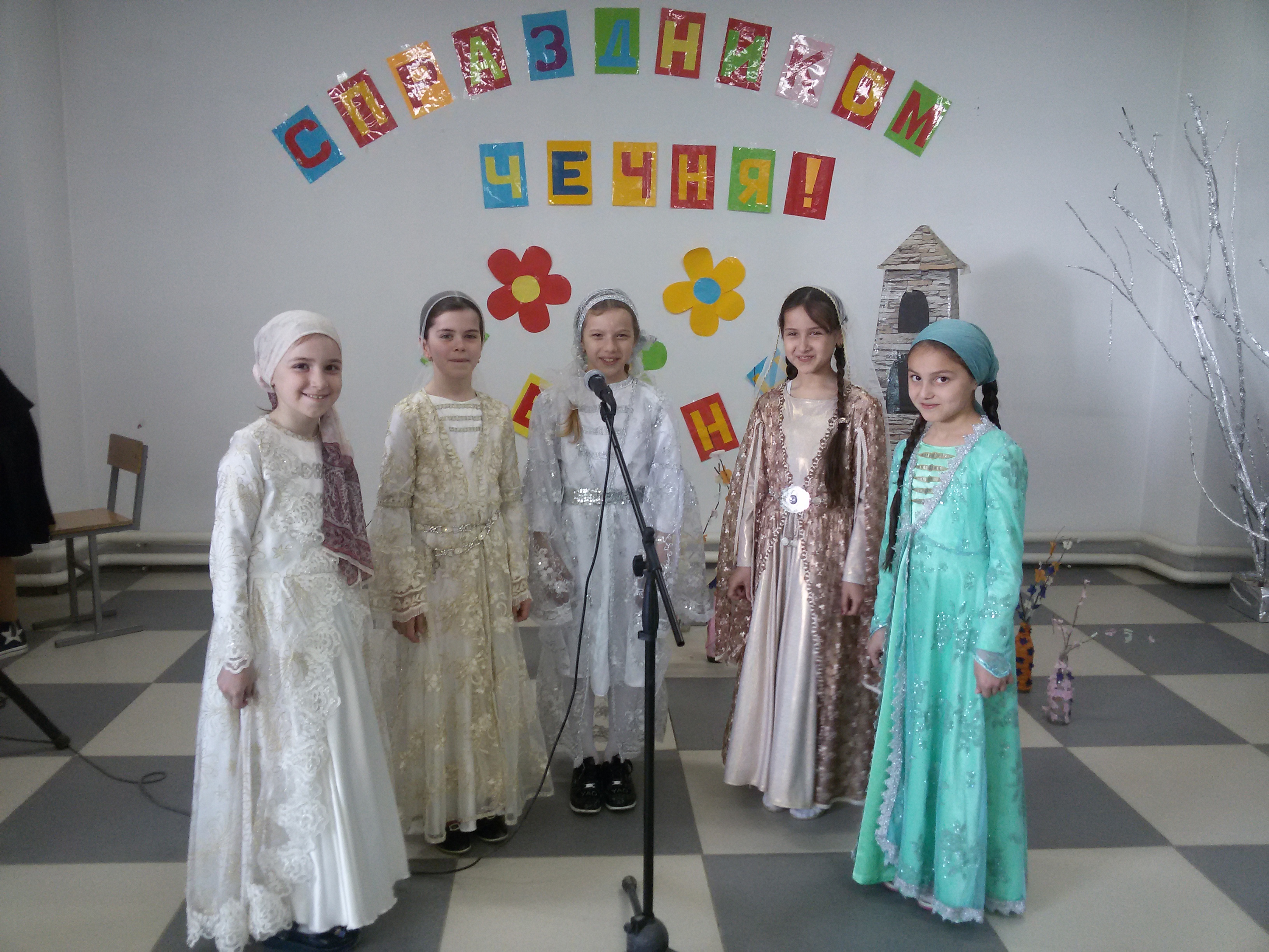 Композицию начала ученица 1 «А» класса Абдурашидова Амина исполнением гимна Чеченской Республики. Учащиеся рассказали стихи М.Дикаева, Баширова В.А., Хатуева А.-Х.и других поэтов о Родине и Чечне, а также исполняли любимые песни на стихи своих односельчан Баширова В.А. и Хатуева А.-Х.. Зрительские овации не смолкали после исполнения национального танца хореографической группы «Маьлхан з1аьнарш» под руководством Межидовой Лизы Лабазановны. Почти все участницы были в национальных костюмах. Примерно10-15 лет назад о таких костюмах мы могли только мечтать. А звонкий голос Исраиловой Айшат, ученицы 10 «А» класса слушали с замиранием сердца. Праздничная композиция не оставила равнодушным никого из присутствующих в зале, потому что все что связано с Чечней и Днем ее поворота к миру и стабильности не может не затронуть каждого жителя нашей Республики.