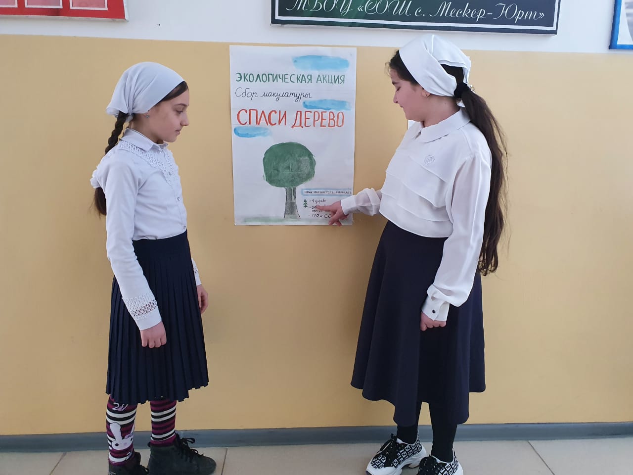 11 февраля 2021 года в МБОУ «СОШ с.Мескер-Юрт» стартовала ежегодная экологическая акция «Сдай макулатуру-спаси дерево!», участниками которой стали около 500 учащихся. Инициаторами данного мероприятия стали активисты РДШ, движение волонтеров-экологов «Юный эколог», «Эколята», педагоги, родительский комитет школы.