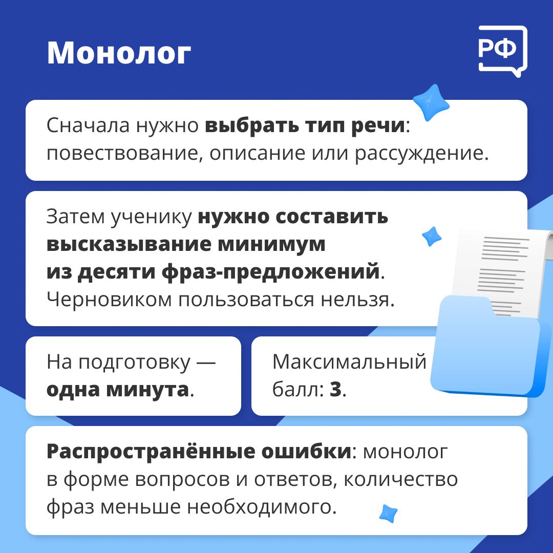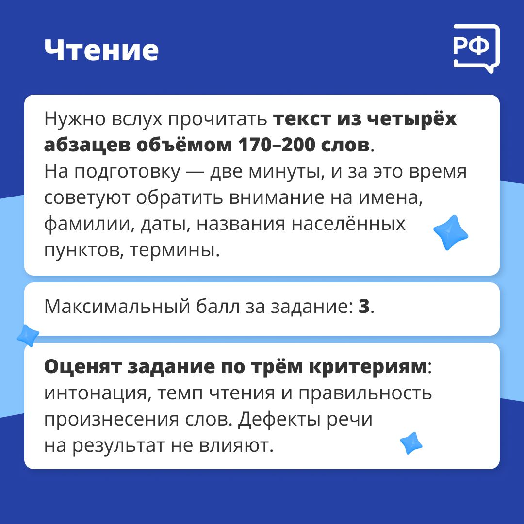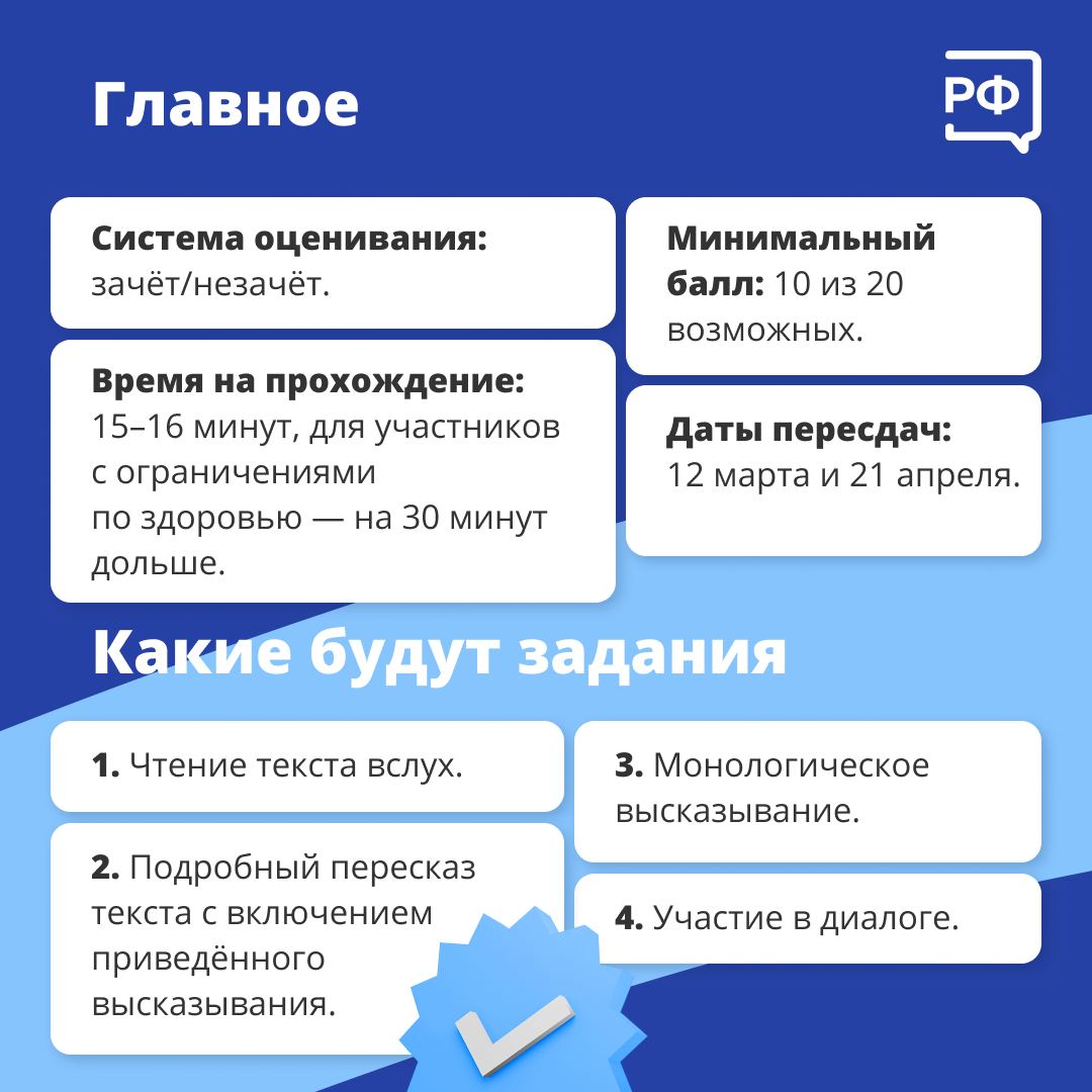 В ходе итогового собеседования ученики будут выполнять четыре задания: чтение текста вслух, пересказ этого текста с использованием дополнительной информации, монологическое высказывание по одной из выбранных тем и диалог с экзаменатором. На выполнение всех заданий отводится примерно 15 минут.