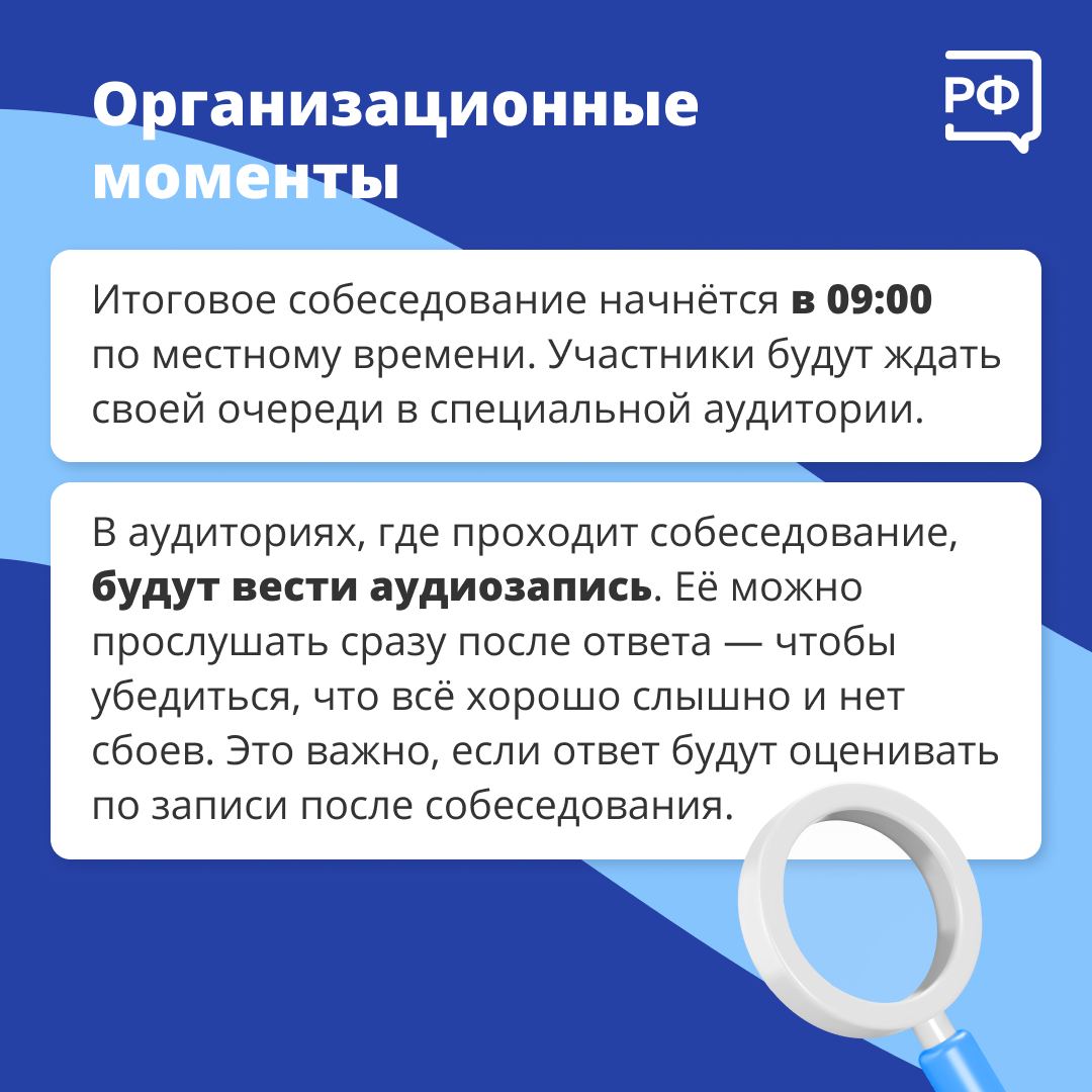 Собеседование будет проводиться в школах, где учатся участники. Для тех, кто не сможет пройти его в основной день, предусмотрены дополнительные даты. Результаты собеседования станут известны в течение нескольких дней после его проведения. Успешное прохождение испытания является обязательным условием для допуска к государственной итоговой аттестации.